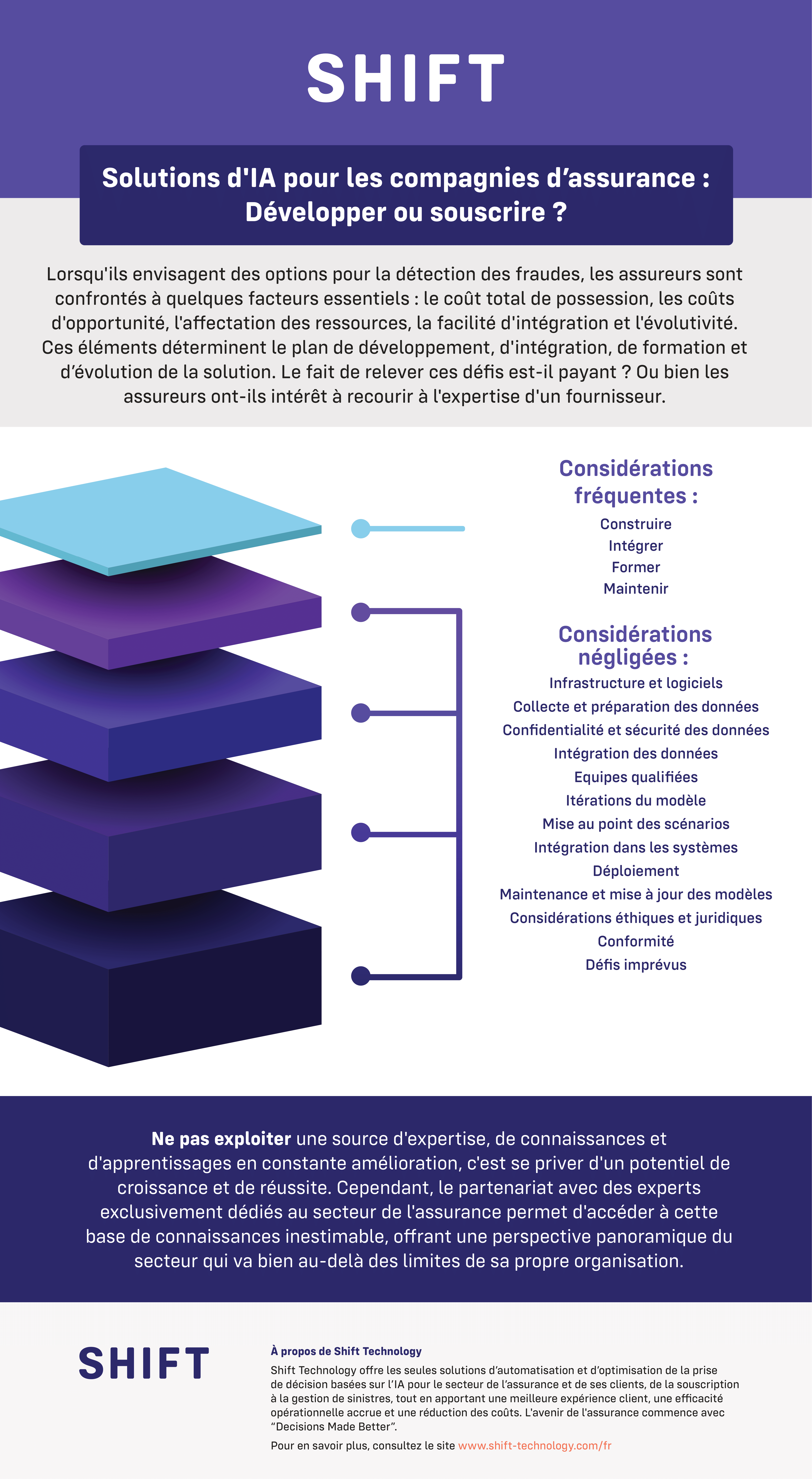 Lorsqu'ils envisagent différentes options pour la détection des fraudes, les assureurs considèrent les facteurs suivants : le coût total de possession, les coûts d'opportunité, l'affectation des ressources, la facilité d'intégration et la stratégie à long terme. Considérer l'Intelligence Artificielle pour lutter contre la fraude donne encore plus d'importance à chacun de ces facteurs. Ces critères permettent aux assureurs d'évaluer le coût de création, d'intégration, de formation et de maintenance d'une solution viable.