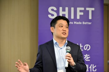 最初に登壇したのは、Shift Technology Japan株式会社でカントリーマネジングディレクターを務める藤井達司です。シフトテクノロジーのこれまでの歩みならびに実績、今後の展望などについて語りました。